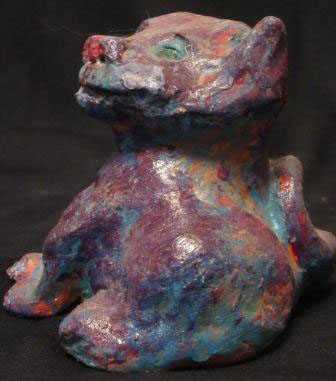 Cat from Another Dimension: 4" wide x 4" high x 4.5" deep Durable air-dried clay, finished with acrylic.